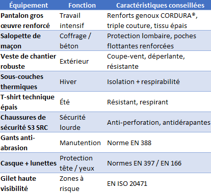 Les vêtements doivent être ultra-résistants, protecteurs et conçus pour un usage intensif.